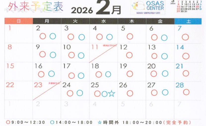 2月の外来予定表 2026.01.5 Tweet Share +1 Hatena Pocket RSS feedly Pin it 1月の外来予定表・年末年始、臨時休診のお知らせ前の記事 3月の外来予定表次の記事